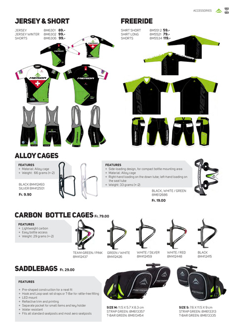 FEATURES + Material: Alloy cage + Weight: 66 grams (+-2) BLAck 8M412493 siLVer 8M412501 FEATURES + side-loading design, for compact bottle mounting area + Material: Alloy cage + right-hand loading on the down tube; left-hand loading on the seat tube + Weight: 33 grams (+-2) BLAck, WHite / GreeN 8M612686