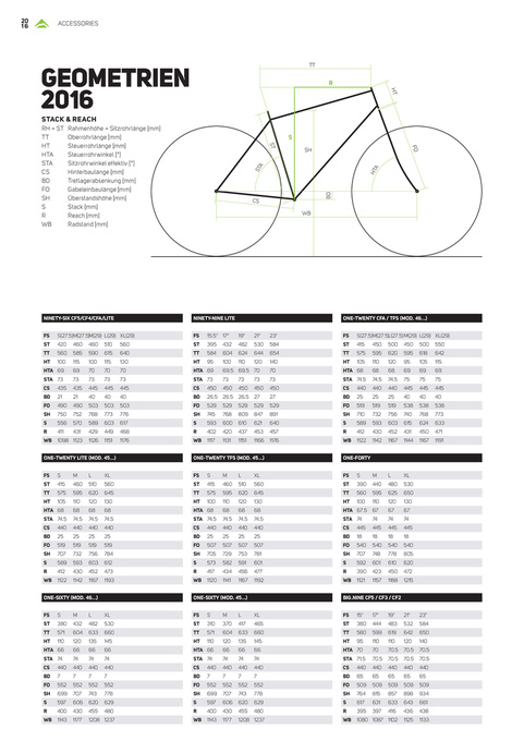 rH = st tt Ht HtA stA cs BD Fo sH s r WB rahmenhöhe = sitzrohrlänge [mm] oberrohrlänge [mm] steuerrohrlänge [mm] steuerrohrwinkel [°] sitzrohrwinkel effektiv [°] Hinterbaulänge [mm] tretlagerabsenkung [mm] Gabeleinbaulänge [mm] Überstandshöhe [mm] stack [mm] reach [mm] radstand [mm]