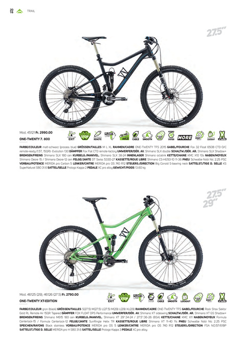 FARBE/COULEUR matt-schwarz (process blue) GRÖSSEN/TAILLES M L XL RAHMEN/CADRE ONE-TWENTY TFS 2015 GABEL/FOURCHE Fox 32 Float 650B CTD O/C remote-ready (1.5T, 15QR)- Evolution 130 DÄMPFER Fox Flat CTD remote-factory UMWERFER/DÉR. AV. Shimano SLX double SCHALTW./DÉR. AR. Shimano SLX Shadow+ BREMSEN/FREINS Shimano SLX 180 cen KURBELG./MANIVEL. Shimano SLX 38-24 INNENLAGER Shimano octalink KETTE/CHAINE KMC X10 10s NABEN/MOYEUX Shimano Deore 15 / Shimano Deore-12 cen FELGE/JANTE DT Swiss 533D-27 KASSETTE/ROUE LIBRE Shimano CS-HG50-10 11-36 PNEU Schwalbe Nobi Nic 2.25 PSC VORBAU/POTENCE MERIDA pro Carbon 5 LENKER/CINTRE MERIDA pro OS 740 R12 STEUERS./DIRECTION Big Conoid S-bearing neck SATTELST./TIGE D. SELLE KS SuperNatural SB0 31.6 SATTEL/SELLE Prologo Kappa 2 PEDALE XC pro alloy GEWICHT/POIDS 13.60 kg