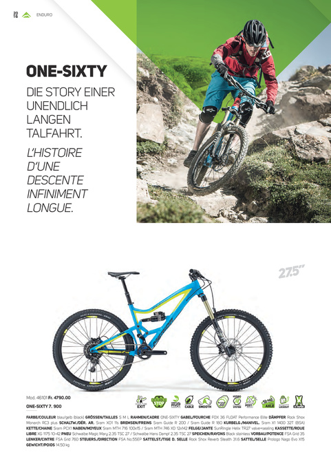 FARBE/COULEUR blau/gelb (black) GRÖSSEN/TAILLES S M L RAHMEN/CADRE ONE-SIXTY GABEL/FOURCHE FOX 36 FLOAT Performance Elite DÄMPFER Rock Shox Monarch RC3 plus SCHALTW./DÉR. AR. Sram XO1 11s BREMSEN/FREINS Sram Guide R 200 / Sram Guide R 180 KURBELG./MANIVEL. Sram X1 1400 32T (BSA) KETTE/CHAINE Sram PCX1 NABEN/MOYEUX Sram MTH 716 100x15 / Sram MTH 746 XD 12x142 FELGE/JANTE SunRingle Helix TR27 valve+sealing KASSETTE/ROUE LIBRE XG 1175 10-42 PNEU Schwalbe Magic Mary 2.35 TSC 27 / Schwalbe Hans Dampf 2.35 TSC 27 SPEICHEN/RAYONS Black stainless VORBAU/POTENCE FSA Grid 35 LENKER/CINTRE FSA Grid 760 STEUERS./DIRECTION FSA No.55EP SATTELST./TIGE D. SELLE Rock Shox Reverb Stealth 31.6 SATTEL/SELLE Prologo Nago Evo X15 GEWICHT/POIDS 14.50 kg