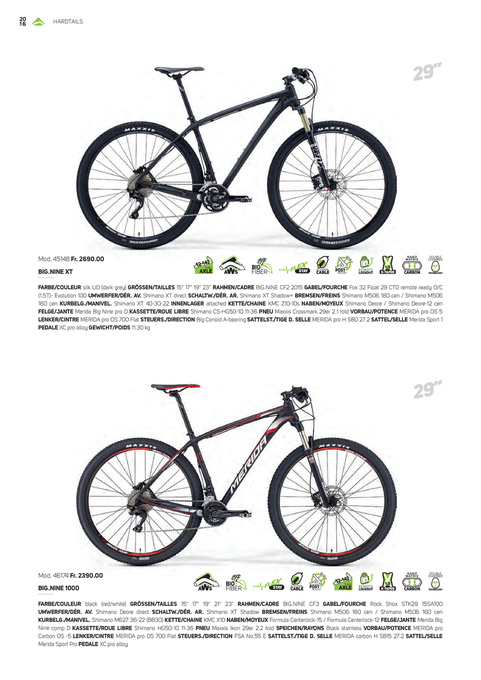 FARBE/COULEUR silk UD (dark grey) GRÖSSEN/TAILLES 15" 17" 19" 23" RAHMEN/CADRE BIG.NINE CF2 2015 GABEL/FOURCHE Fox 32 Float 29 CTD remote ready O/C (1.5T)- Evolution 100 UMWERFER/DÉR. AV. Shimano XT direct SCHALTW./DÉR. AR. Shimano XT Shadow+ BREMSEN/FREINS Shimano M506 180 cen / Shimano M506 160 cen KURBELG./MANIVEL. Shimano XT 40-30-22 INNENLAGER attached KETTE/CHAINE KMC Z10-10s NABEN/MOYEUX Shimano Deore / Shimano Deore-12 cen FELGE/JANTE Merida Big Nine pro D KASSETTE/ROUE LIBRE Shimano CS-HG50-10 11-36 PNEU Maxxis Crossmark 29er 2.1 fold VORBAU/POTENCE MERIDA pro OS 5 LENKER/CINTRE MERIDA pro OS 700 Flat STEUERS./DIRECTION Big Conoid A-bearing SATTELST./TIGE D. SELLE MERIDA pro H SB0 27.2 SATTEL/SELLE Merida Sport 1 PEDALE XC pro alloy GEWICHT/POIDS 11.30 kg