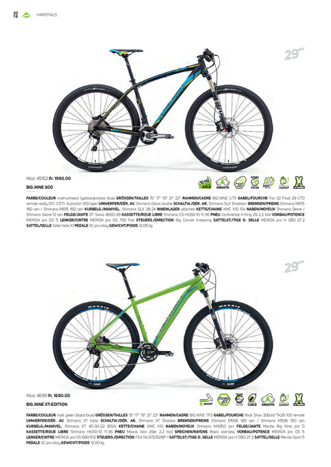 FARBE/COULEUR matt-schwarz (yellow/process blue) GRÖSSEN/TAILLES 15" 17" 19" 21" 23" RAHMEN/CADRE BIG.NINE LITE GABEL/FOURCHE Fox 32 Float 29 CTD remote ready O/C (1.5T)- Evolution 100 taper UMWERFER/DÉR. AV. Shimano Deore double SCHALTW./DÉR. AR. Shimano SLX Shadow+ BREMSEN/FREINS Shimano M615 180 cen / Shimano M615 160 cen KURBELG./MANIVEL. Shimano SLX 38-24 INNENLAGER attached KETTE/CHAINE KMC X10 10s NABEN/MOYEUX Shimano Deore / Shimano Deore-12 cen FELGE/JANTE DT Swiss 466D-29 KASSETTE/ROUE LIBRE Shimano CS-HG50-10 11-36 PNEU Continental X-King 29 2.2 fold VORBAU/POTENCE MERIDA pro OS 5 LENKER/CINTRE MERIDA pro OS 700 Flat STEUERS./DIRECTION Big Conoid A-bearing SATTELST./TIGE D. SELLE MERIDA pro H SB0 27.2 SATTEL/SELLE Selle Italia X1 PEDALE XC pro alloy GEWICHT/POIDS 12.05 kg