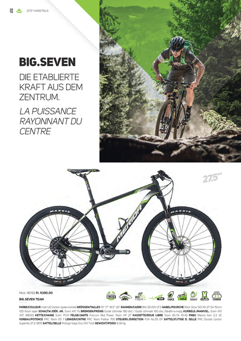 FARBE/COULEUR matt UD Carbon (green/white) GRÖSSEN/TAILLES 15" 17" 18.5" 20" RAHMEN/CADRE BIG.SEVEN CF3 GABEL/FOURCHE Rock Shox SID XX-27 SA 15mm 100 Xlock taper SCHALTW./DÉR. AR. Sram XX1 11s BREMSEN/FREINS Guide Ultimate 180 disc / Guide Ultimate 160 disc Stealth-a-majig KURBELG./MANIVEL. Sram XX1 34T (BB30) KETTE/CHAINE Sram PCX1 FELGE/JANTE Fulcrum Red Power Team HP 27 KASSETTE/ROUE LIBRE Sram XG-11s 10-42 PNEU Maxxis Ikon 2.2 3C VORBAU/POTENCE PRC Team OS 7 LENKER/CINTRE PRC Team Flatbar 700 STEUERS./DIRECTION FSA No.55 EP SATTELST./TIGE D. SELLE PRC Double Carbon Superlite 27.2 SB15 SATTEL/SELLE Prologo Nago Evo X10 TiroX GEWICHT/POIDS 9.30 kg