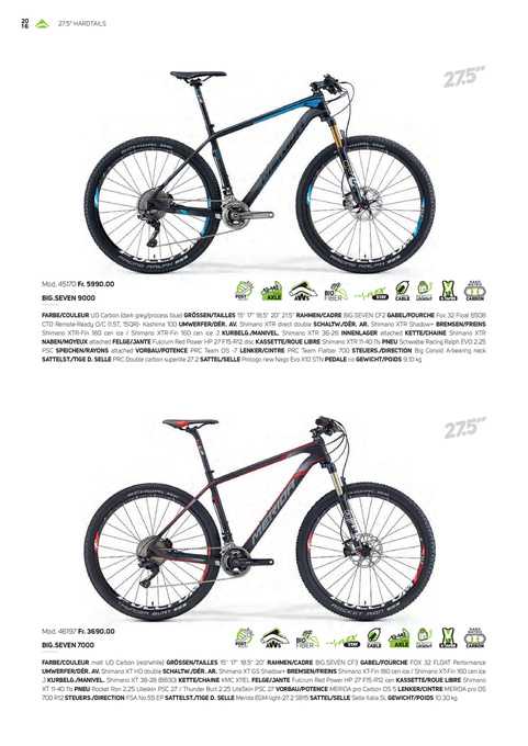 FARBE/COULEUR UD Carbon (dark grey/process blue) GRÖSSEN/TAILLES 15" 17" 18.5" 20" 21.5" RAHMEN/CADRE BIG.SEVEN CF2 GABEL/FOURCHE Fox 32 Float 650B CTD Remote-Ready O/C (1.5T, 15QR)- Kashima 100 UMWERFER/DÉR. AV. Shimano XTR direct double SCHALTW./DÉR. AR. Shimano XTR Shadow+ BREMSEN/FREINS Shimano XTR-Fin 180 cen ice / Shimano XTR-Fin 160 cen ice J KURBELG./MANIVEL. Shimano XTR 36-26 INNENLAGER attached KETTE/CHAINE Shimano XTR NABEN/MOYEUX attached FELGE/JANTE Fulcrum Red Power HP 27 F15-R12 disc KASSETTE/ROUE LIBRE Shimano XTR 11-40 11s PNEU Schwalbe Racing Ralph EVO 2.25 PSC SPEICHEN/RAYONS attached VORBAU/POTENCE PRC Team OS -7 LENKER/CINTRE PRC Team Flatbar 700 STEUERS./DIRECTION Big Conoid A-bearing neck SATTELST./TIGE D. SELLE PRC Double carbon superlite 27.2 SATTEL/SELLE Prologo new Nago Evo X10 STN PEDALE no GEWICHT/POIDS 9.10 kg