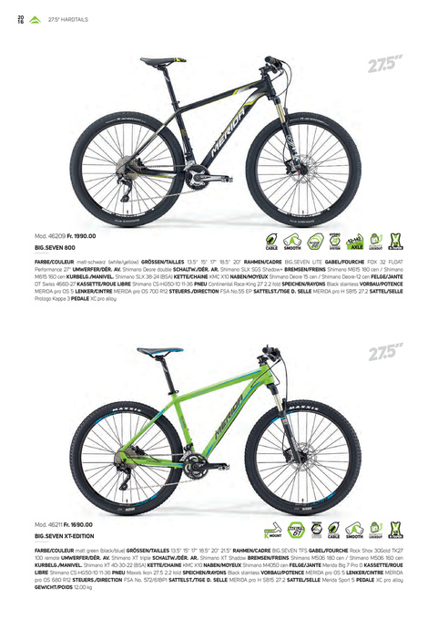 FARBE/COULEUR matt-schwarz (white/yellow) GRÖSSEN/TAILLES 13.5" 15" 17" 18.5" 20" RAHMEN/CADRE BIG.SEVEN LITE GABEL/FOURCHE FOX 32 FLOAT Performance 27" UMWERFER/DÉR. AV. Shimano Deore double SCHALTW./DÉR. AR. Shimano SLX SGS Shadow+ BREMSEN/FREINS Shimano M615 180 cen / Shimano M615 160 cen KURBELG./MANIVEL. Shimano SLX 38-24 (BSA) KETTE/CHAINE KMC X10 NABEN/MOYEUX Shimano Deore 15 cen / Shimano Deore-12 cen FELGE/JANTE DT Swiss 466D-27 KASSETTE/ROUE LIBRE Shimano CS-HG50-10 11-36 PNEU Continental Race-King 27 2.2 fold SPEICHEN/RAYONS Black stainless VORBAU/POTENCE MERIDA pro OS 5 LENKER/CINTRE MERIDA pro OS 700 R12 STEUERS./DIRECTION FSA No.55 EP SATTELST./TIGE D. SELLE MERIDA pro H SB15 27.2 SATTEL/SELLE Prologo Kappa 3 PEDALE XC pro alloy