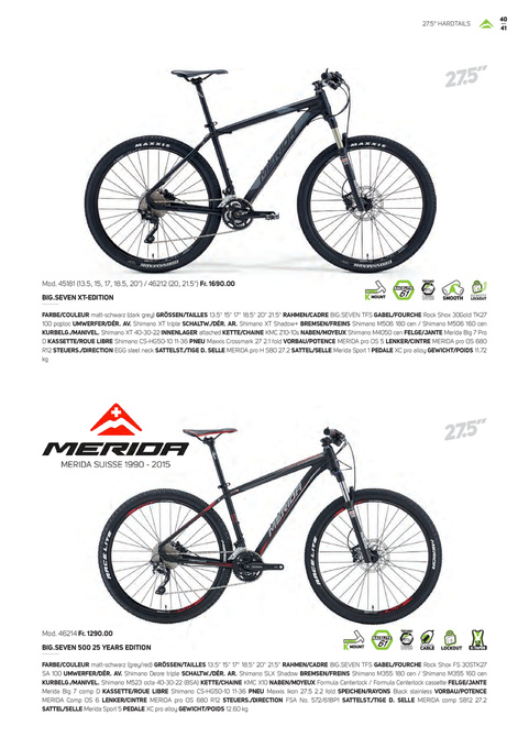 FARBE/COULEUR matt-schwarz (dark grey) GRÖSSEN/TAILLES 13.5" 15" 17" 18.5" 20" 21.5" RAHMEN/CADRE BIG.SEVEN TFS GABEL/FOURCHE Rock Shox 30Gold TK27 100 poploc UMWERFER/DÉR. AV. Shimano XT triple SCHALTW./DÉR. AR. Shimano XT Shadow+ BREMSEN/FREINS Shimano M506 180 cen / Shimano M506 160 cen KURBELG./MANIVEL. Shimano XT 40-30-22 INNENLAGER attached KETTE/CHAINE KMC Z10-10s NABEN/MOYEUX Shimano M4050 cen FELGE/JANTE Merida Big 7 Pro D KASSETTE/ROUE LIBRE Shimano CS-HG50-10 11-36 PNEU Maxxis Crossmark 27 2.1 fold VORBAU/POTENCE MERIDA pro OS 5 LENKER/CINTRE MERIDA pro OS 680 R12 STEUERS./DIRECTION EGG steel neck SATTELST./TIGE D. SELLE MERIDA pro H SB0 27.2 SATTEL/SELLE Merida Sport 1 PEDALE XC pro alloy GEWICHT/POIDS 11.72 kg