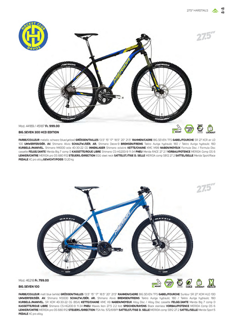 FARBE/COULEUR metallic schwarz (blue/yellow) GRÖSSEN/TAILLES 13.5" 15" 17" 18.5" 20" 21.5" RAHMEN/CADRE BIG.SEVEN TFS GABEL/FOURCHE SR 27 XCR air LO 100 UMWERFER/DÉR. AV. Shimano Alivio SCHALTW./DÉR. AR. Shimano Deore-9 BREMSEN/FREINS Tektro Auriga hydraulic 180 / Tektro Auriga hydraulic 160 KURBELG./MANIVEL. Shimano M4000 octa 40-30-22 CG INNENLAGER Shimano octalink KETTE/CHAINE KMC M99 NABEN/MOYEUX Formula Disc / Formula Disc cassette FELGE/JANTE Merida Big 7 comp D KASSETTE/ROUE LIBRE Shimano CS-HG200-9 11-34 PNEU Merida RACE 27 2.1 VORBAU/POTENCE MERIDA Comp OS 6 LENKER/CINTRE MERIDA pro OS 680 R12 STEUERS./DIRECTION EGG steel neck SATTELST./TIGE D. SELLE MERIDA comp SB12 27.2 SATTEL/SELLE Merida Sport/Race PEDALE XC pro alloy GEWICHT/POIDS 13.20 kg