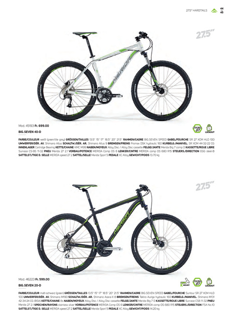 FARBE/COULEUR weiß (green/lite grey) GRÖSSEN/TAILLES 13.5" 15" 17" 18.5" 20" 21.5" RAHMEN/CADRE BIG.SEVEN SPEED GABEL/FOURCHE SR 27 XCM HLO 100 UMWERFER/DÉR. AV. Shimano Altus SCHALTW./DÉR. AR. Shimano Altus 9 BREMSEN/FREINS Promax DSK hydraulic 160 KURBELG./MANIVEL. SR XCM 44-32-22 CG INNENLAGER Cartridge Bearing KETTE/CHAINE KMC M99 NABEN/MOYEUX Alloy Disc / Alloy Disc cassette FELGE/JANTE Merida Big 7 comp D KASSETTE/ROUE LIBRE Sunrace CS-9S 11-32 PNEU Merida 27 2.1 VORBAU/POTENCE MERIDA Comp OS 6 LENKER/CINTRE MERIDA comp OS 680 R15 STEUERS./DIRECTION EGG steel-B SATTELST./TIGE D. SELLE MERIDA speed 27.2 SATTEL/SELLE Merida Sport 5 PEDALE XC Alloy GEWICHT/POIDS 13.70 kg