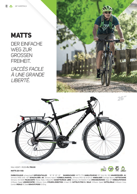 FARBE/COULEUR schwarz/weiß GRÖSSEN/TAILLES 16" 18" 20" 22" RAHMEN/CADRE MATTS TFS GABEL/FOURCHE RST GILA ML 100 UMWERFER/DÉR. AV. Shimano M190 34.9 -42T SCHALTW./DÉR. AR. Shimano Acera-X KURBELG./MANIVEL. Shimano M131 42-34-24 CG INNENLAGER Cartridge Bearing KETTE/CHAINE Shimano CN-HG40 FELGE/JANTE Merida Matts V-Black/NC KASSETTE/ROUE LIBRE Shimano CS-HG30-8 11-32 SPEICHEN/RAYONS Steel CP VORBAU/POTENCE X-Mission Speed LENKER/CINTRE X-Mission Comp STEUERS./DIRECTION A-Head OS SATTELST./TIGE D. SELLE X-Mission Speed SATTEL/SELLE X-Mission Cross Comfort PEDALE XC Steel GEWICHT/POIDS 13.10 kg