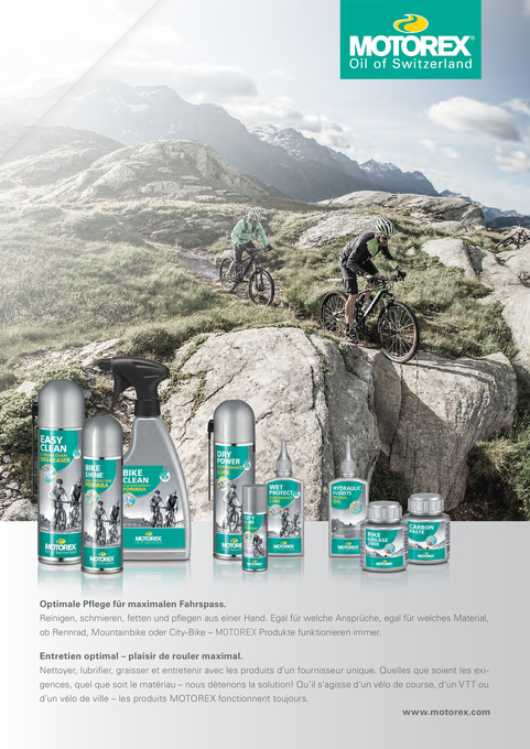 Nettoyer, lubrifier, graisser et entretenir avec les produits d’un fournisseur unique. Quelles que soient les exigences, quel que soit le matériau – nous détenons la solution! Qu’il s’agisse d’un vélo de course, d’un VTT ou d’un vélo de ville – les produits MOTOREX fonctionnent toujours. www.motorex.com