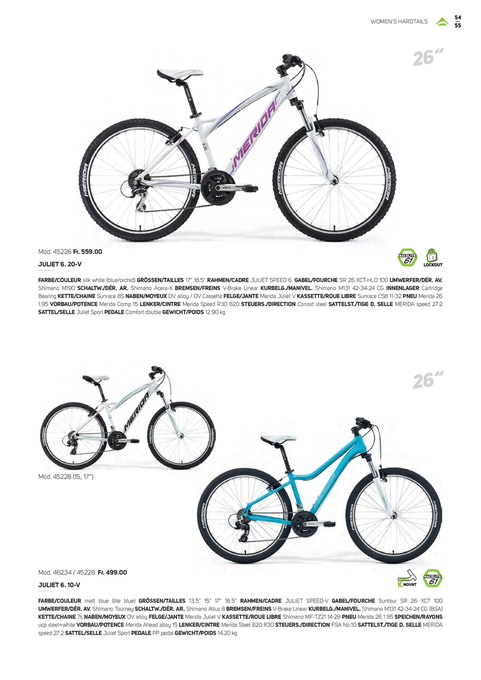 FARBE/COULEUR matt blue (lite blue) GRÖSSEN/TAILLES 13.5" 15" 17" 18.5" RAHMEN/CADRE JULIET SPEED-V GABEL/FOURCHE Suntour SR 26 XCT 100 UMWERFER/DÉR. AV. Shimano Tourney SCHALTW./DÉR. AR. Shimano Altus 8 BREMSEN/FREINS V-Brake Linear KURBELG./MANIVEL. Shimano M131 42-34-24 CG (BSA) KETTE/CHAINE 7s NABEN/MOYEUX OV alloy FELGE/JANTE Merida Juliet V KASSETTE/ROUE LIBRE Shimano MF-TZ21 14-28 PNEU Merida 26 1.95 SPEICHEN/RAYONS ucp steel+white VORBAU/POTENCE Merida Ahead alloy 15 LENKER/CINTRE Merida Steel 620 R30 STEUERS./DIRECTION FSA No.10 SATTELST./TIGE D. SELLE MERIDA speed 27.2 SATTEL/SELLE Juliet Sport PEDALE PP pedal GEWICHT/POIDS 14.20 kg