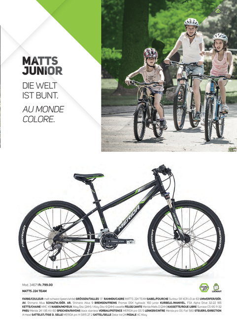 FARBE/COULEUR matt-schwarz (green/white) GRÖSSEN/TAILLES 13" RAHMEN/CADRE MATTS J24 TEAM GABEL/FOURCHE Suntour SR XCR LO air 63 UMWERFER/DÉR. AV. Shimano Altus SCHALTW./DÉR. AR. Shimano Altus 9 BREMSEN/FREINS Promax DSK hydraulic 160 junior KURBELG./MANIVEL. FSA Alpha Drive 32-22 165 KETTE/CHAINE KMC X9 NABEN/MOYEUX Alloy Disc [24H] / Alloy Disc-9 [24H] cassette FELGE/JANTE Merida Matts D [24H] KASSETTE/ROUE LIBRE Sunrace CS-9S 11-32 PNEU Merida 24 1.95 KV 60 SPEICHEN/RAYONS black stainless VORBAU/POTENCE MERIDA pro OS 5 LENKER/CINTRE Merida pro OS Flat 580 STEUERS./DIRECTION A-Head SATTELST./TIGE D. SELLE MERIDA pro H SB15 27.2 SATTEL/SELLE Dakar kid 24 PEDALE XC Alloy