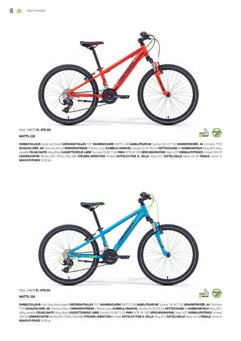 FARBE/COULEUR signal red (black) GRÖSSEN/TAILLES 11.5" RAHMEN/CADRE MATTS J24 GABEL/FOURCHE Suntour SR XCT 50 UMWERFER/DÉR. AV. Shimano TY10 SCHALTW./DÉR. AR. Shimano Altus 8 BREMSEN/FREINS V-Brake Linear KURBELG./MANIVEL. Double 32-22 152 CG KETTE/CHAINE 8s NABEN/MOYEUX Alloy QR / Alloy cassette FELGE/JANTE Alloy Black KASSETTE/ROUE LIBRE Sunrace CS-8S 11-32 PNEU MTB 24 1.95 SPEICHEN/RAYONS Steel UCP VORBAU/POTENCE A-Head CEN 15 LENKER/CINTRE Merida CEN STEEL Rise 580 STEUERS./DIRECTION A-Head SATTELST./TIGE D. SELLE Alloy 27.2 SATTEL/SELLE Dakar kid 24 PEDALE Junior fit GEWICHT/POIDS 12.90 kg