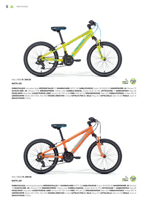 FARBE/COULEUR matt orange (blue/white) GRÖSSEN/TAILLES 10" RAHMEN/CADRE MATTS J20 GABEL/FOURCHE Suntour SR M3010 50 UMWERFER/DÉR. AV. Shimano TZ SCHALTW./DÉR. AR. Shimano FT35 BREMSEN/FREINS V-Brake Linear KURBELG./MANIVEL. Double 32-22 CG 115L KETTE/CHAINE 7s NABEN/MOYEUX Alloy QR FELGE/JANTE Alloy Black KASSETTE/ROUE LIBRE Shimano MF-TZ21 14-28 PNEU MTB 20 2.0 SPEICHEN/RAYONS Steel UCP VORBAU/POTENCE A-Head CEN 15 LENKER/CINTRE Merida CEN STEEL Rise 540 STEUERS./DIRECTION A-Head SATTELST./TIGE D. SELLE Alloy 27.2 SATTEL/SELLE Dakar kid 20 PEDALE Junior fit GEWICHT/POIDS 11.40 kg