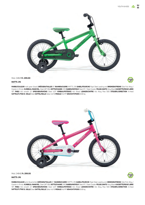 FARBE/COULEUR pink (blue/white) GRĂ–SSEN/TAILLES 9" RAHMEN/CADRE MATTS J16 GABEL/FOURCHE Rigid Steel Leading end BREMSEN/FREINS Side Pull Alloy / Coaster in R.Hub. KURBELG./MANIVEL. Steel 28T 89L KETTE/CHAINE Z410 NABEN/MOYEUX Steel NT / Steel Coaster FELGE/JANTE Alloy Black KASSETTE/ROUE LIBRE 16T PNEU Kid smooth 2.1 SPEICHEN/RAYONS Steel UCP VORBAU/POTENCE Kid Ahead LENKER/CINTRE Kid Alloy Rise 500 STEUERS./DIRECTION A-Head SATTELST./TIGE D. SELLE Steel SATTEL/SELLE Dakar kid 16 PEDALE Kid PP GEWICHT/POIDS 9.90 kg