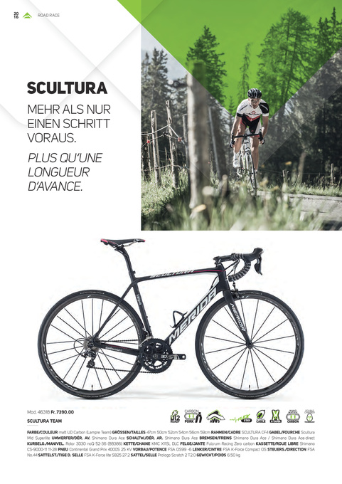 FARBE/COULEUR matt UD Carbon (Lampre Team) GRÖSSEN/TAILLES 47cm 50cm 52cm 54cm 56cm 59cm RAHMEN/CADRE SCULTURA CF4 GABEL/FOURCHE Scultura Mid Superlite UMWERFER/DÉR. AV. Shimano Dura Ace SCHALTW./DÉR. AR. Shimano Dura Ace BREMSEN/FREINS Shimano Dura Ace / Shimano Dura Ace-direct KURBELG./MANIVEL. Rotor 3D30 noQ 52-36 (BB386) KETTE/CHAINE KMC X11SL DLC FELGE/JANTE Fulcrum Racing Zero carbon KASSETTE/ROUE LIBRE Shimano CS-9000-11 11-28 PNEU Continental Grand Prix 4000S 25 KV VORBAU/POTENCE FSA OS99 -6 LENKER/CINTRE FSA K-Force Compact OS STEUERS./DIRECTION FSA No.44 SATTELST./TIGE D. SELLE FSA K-Force lite SB25 27.2 SATTEL/SELLE Prologo Scratch 2 T2.0 GEWICHT/POIDS 6.50 kg