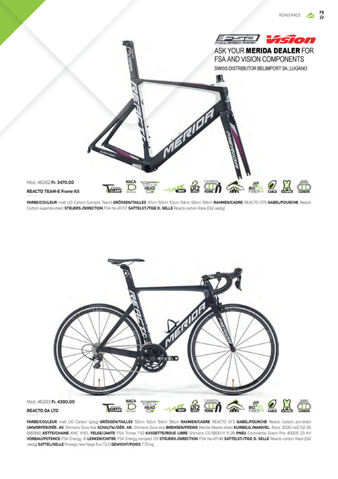 FARBE/COULEUR matt UD Carbon (grey) GRÖSSEN/TAILLES 50cm 52cm 54cm 56cm RAHMEN/CADRE REACTO CF3 GABEL/FOURCHE Reacto Carbon pro-direct UMWERFER/DÉR. AV. Shimano Dura Ace SCHALTW./DÉR. AR. Shimano Dura Ace BREMSEN/FREINS Merida Reacto direct KURBELG./MANIVEL. Rotor 3D30 noQ 52-36 (BB386) KETTE/CHAINE KMC X11EL FELGE/JANTE FSA Trimax T42 KASSETTE/ROUE LIBRE Shimano CS-5800-11 11-28 PNEU Continental Grand Prix 4000S 23 KV VORBAU/POTENCE FSA Energy -6 LENKER/CINTRE FSA Energy compact OS STEUERS./DIRECTION FSA No.47/48 SATTELST./TIGE D. SELLE Reacto carbon Race [Di2 ready] SATTEL/SELLE Prologo new Nago Evo T2.0 GEWICHT/POIDS 7.70 kg