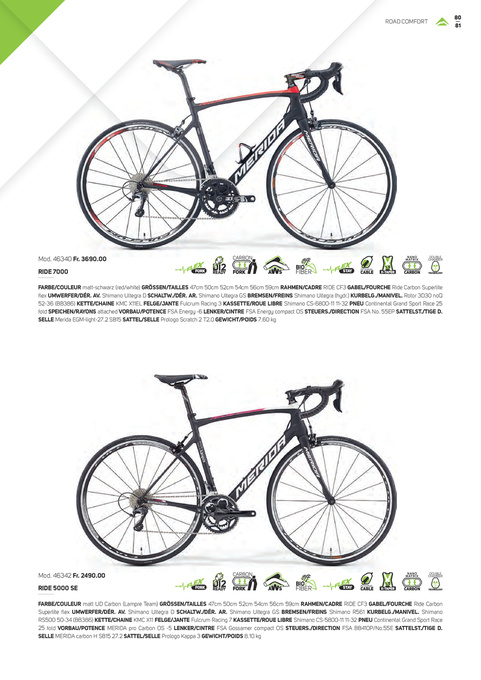 FARBE/COULEUR matt-schwarz (red/white) GRÖSSEN/TAILLES 47cm 50cm 52cm 54cm 56cm 59cm RAHMEN/CADRE RIDE CF3 GABEL/FOURCHE Ride Carbon Superlite flex UMWERFER/DÉR. AV. Shimano Ultegra D SCHALTW./DÉR. AR. Shimano Ultegra GS BREMSEN/FREINS Shimano Ultegra (hydr.) KURBELG./MANIVEL. Rotor 3D30 noQ 52-36 (BB386) KETTE/CHAINE KMC X11EL FELGE/JANTE Fulcrum Racing 3 KASSETTE/ROUE LIBRE Shimano CS-6800-11 11-32 PNEU Continental Grand Sport Race 25 fold SPEICHEN/RAYONS attached VORBAU/POTENCE FSA Energy -6 LENKER/CINTRE FSA Energy compact OS STEUERS./DIRECTION FSA No. 55EP SATTELST./TIGE D. SELLE Merida EGM-light-27.2 SB15 SATTEL/SELLE Prologo Scratch 2 T2.0 GEWICHT/POIDS 7.60 kg