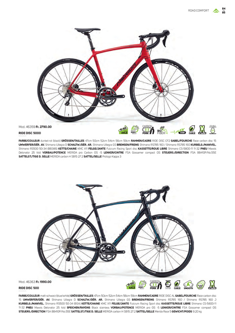 FARBE/COULEUR matt-schwarz (blue/white) GRÖSSEN/TAILLES 47cm 50cm 52cm 54cm 56cm 59cm RAHMEN/CADRE RIDE DISC AL GABEL/FOURCHE Race carbon disc 15 UMWERFER/DÉR. AV. Shimano Ultegra D SCHALTW./DÉR. AR. Shimano Ultegra GS BREMSEN/FREINS Shimano RS785 160 / Shimano RS785 160 J KURBELG./MANIVEL. Shimano RS500 50-34 (BSA) KETTE/CHAINE KMC X11 FELGE/JANTE Fulcrum Racing Sport disc KASSETTE/ROUE LIBRE Shimano CS-5800-11 11-32 PNEU Maxxis Detonator 25 fold SPEICHEN/RAYONS Black stainless VORBAU/POTENCE MERIDA pro OS -5 LENKER/CINTRE FSA Gossamer compact OS STEUERS./DIRECTION FSA BB410P/No.55E SATTELST./TIGE D. SELLE MERIDA carbon H SB15 27.2 SATTEL/SELLE Merida Race 5 GEWICHT/POIDS 9.20 kg
