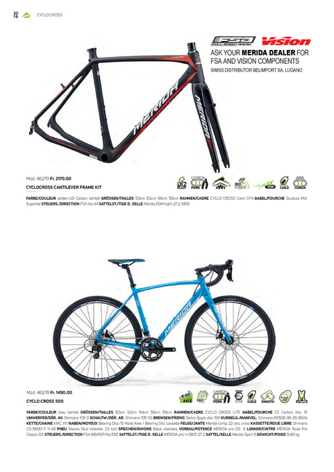 FARBE/COULEUR blau (white) GRÖSSEN/TAILLES 50cm 52cm 54cm 56cm 59cm RAHMEN/CADRE CYCLO CROSS LITE GABEL/FOURCHE CC Carbon disc 15 UMWERFER/DÉR. AV. Shimano 105 D SCHALTW./DÉR. AR. Shimano 105 SS BREMSEN/FREINS Tektro Spyre disc 160 KURBELG./MANIVEL. Shimano RS500 46-36 (BSA) KETTE/CHAINE KMC X11 NABEN/MOYEUX Bearing Disc-15 Road Axle / Bearing Disc cassette FELGE/JANTE Merida comp 22 disc cross KASSETTE/ROUE LIBRE Shimano CS-5800-11 11-28 PNEU Maxxis Mud Wrestler 33 fold SPEICHEN/RAYONS Black stainless VORBAU/POTENCE MERIDA pro OS -5 LENKER/CINTRE MERIDA Road Pro Classic OS STEUERS./DIRECTION FSA BB410P/No.55E SATTELST./TIGE D. SELLE MERIDA pro H SB15 27.2 SATTEL/SELLE Merida Sport 5 GEWICHT/POIDS 9.80 kg